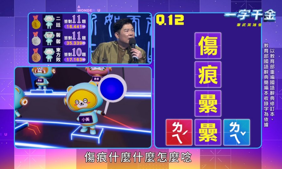 【台北訊】公視旗艦益智節目《一字千金》系列重磅回歸,自8月25日播出全新一季《一字千金 筆武英雄會》節目,新科技運用爆表,除了觀眾可以跨屏互動答題,更與科碼新媒體合作推出全新的《一字雲宇宙》單元,帶來虛實同框競賽的全新體驗!並特邀公視VTuber二期生海月粼粼擔任小幫手,負責單元比賽規則說明及頒獎!主持人曾國城表示:「即將屆滿10年的《一字千金》,這一季將帶給線上線下的觀眾2.0全新體驗!期待更多的想精進中文實力、中文字愛好者被《一字千金》黏住!而且多動腦更可以預防失智症!」