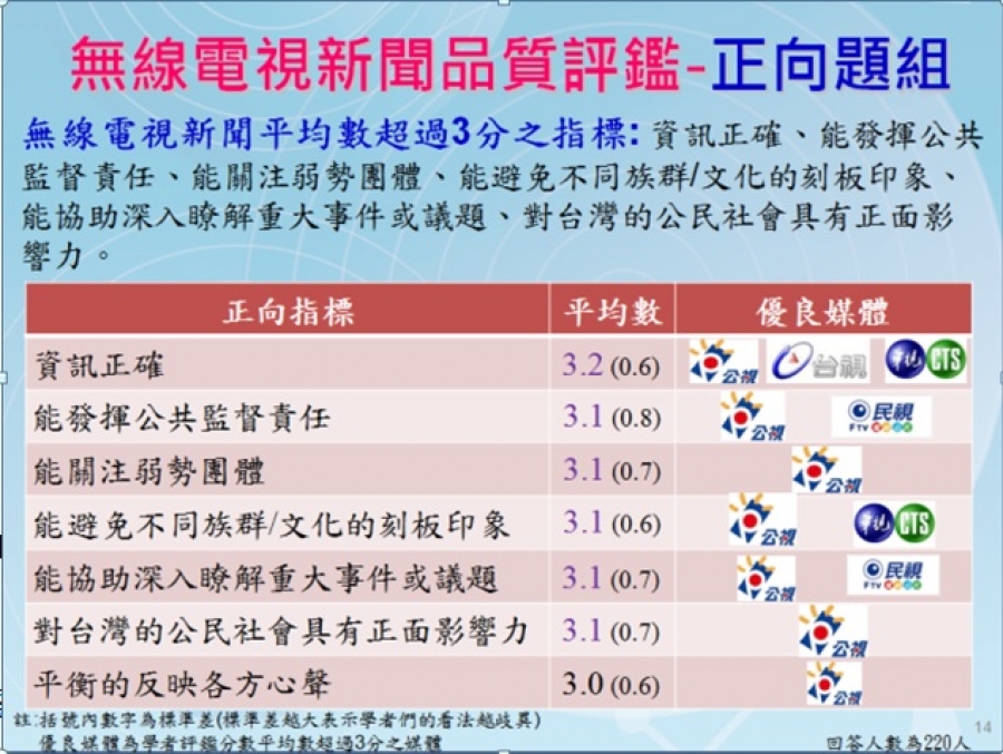 七項無線電視新聞品質評鑑正向指標包括:「資訊正確」、「能發揮公共監督責任」、「能關注弱勢團體」、「能避免不同族群/文化的刻板印象」、「能協助深入瞭解重大事件或議題」、「對臺灣的公民社會具有正面影響力」以及「平衡的反映各方心聲」。