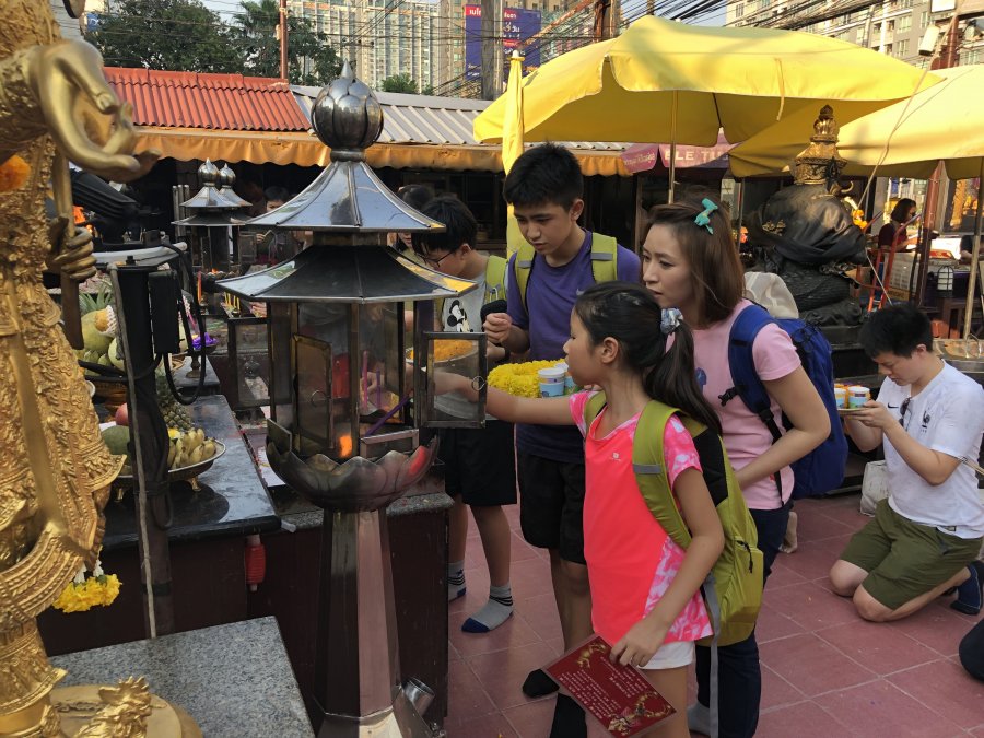 其後則前往象神廟,拜象神初體驗的四人組透過小背包客向攤商詢問,發現參拜時許多要注意的眉角相當有趣,像是香和蠟燭有七彩顏色,是對應每個人出生當天是星期幾有不同的代表色;而拜完象神後在老鼠耳邊許願要記得摀住牠另一隻耳朵,以免「左耳進、右耳出」。湘涵笑說:「我是第一個許願的所以不知道,旁邊花店老闆很好心來提醒之後,我趕快再許一次。」