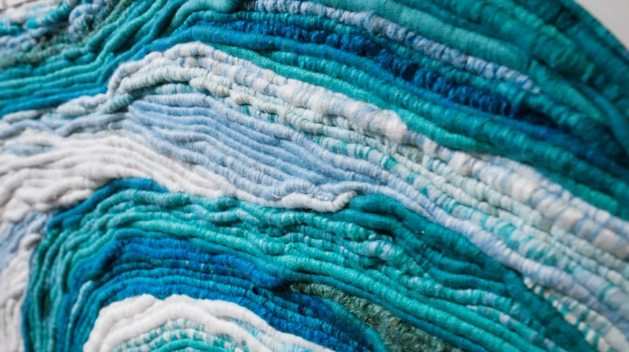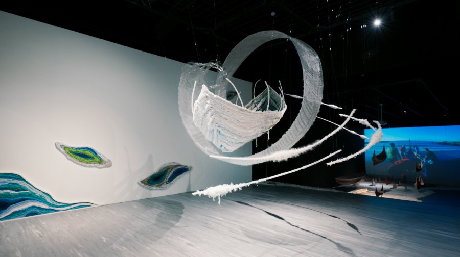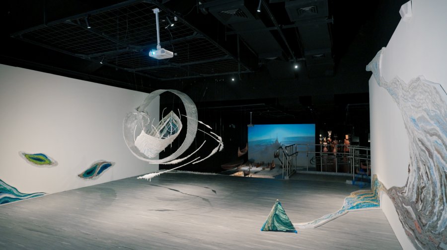 該片更實地拍攝尤瑪2017年至2023年的重要作品,《河殤》、《如生之初》、《生命的迴旋》、《如布之舌》、《河.流.海.揚》系列,透過鏡頭特寫,呈現織品的紋理。尤瑪‧達陸以泰雅編織常用材料羊毛線,呈現河流、海洋的肌理,新作《河.流.海.揚》,當鏡頭隨著作品的綿延起伏,彷彿見到河流自山上滾滾而下,流經山區進入海洋,連結著我們所居住的島嶼。島嶼的中間懸掛著被迴旋式海浪捲起的一條船,海浪中以傳統纏繞的方式意象式地呈現櫻花鉤吻鮭,隱喻著山居的泰雅族人不要忘記自己是來自海洋。