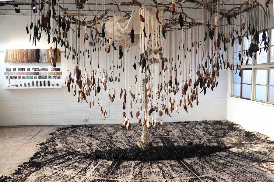 2023年「蠶絲研究計畫」《第四章─上簇》,聚焦台三線苗栗、新竹一帶,自日治時期興盛的蠶絲事業,選用日本的和服布料、蠶絲布、不同類型的蠶絲線、工業生產的作料,以不同的編織技法編織成一片片巨大桑葉,來展現產業不同時期的發展與生態。