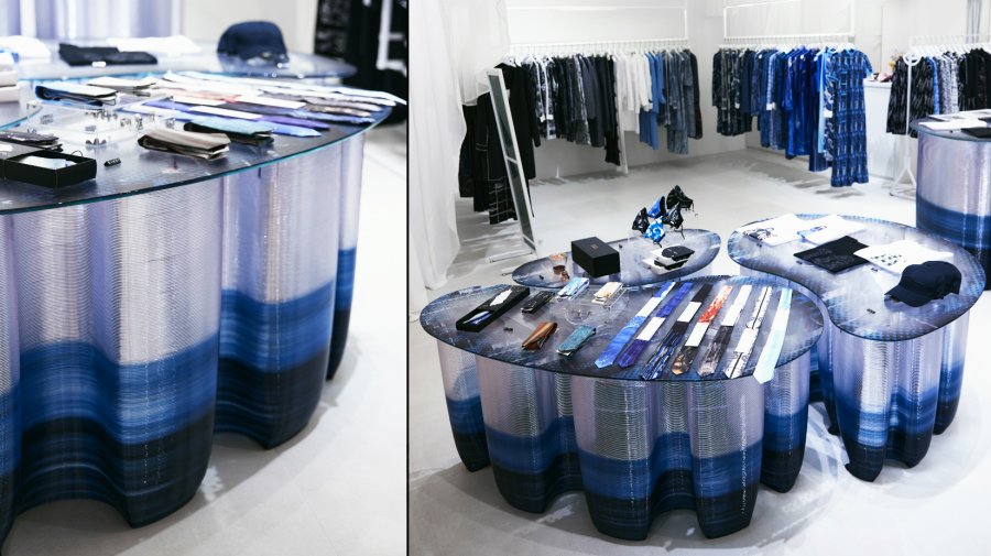 王識源覺得PETG聚對苯二甲酸乙二醇酯是非常迷人的材料有點像玻璃透明 清澈結構性佳又可以回收再利用結合機器人技術與3D列印可以創作出各種造型 除作品《粼光桌》2023應用於服飾品牌「詹朴APUJAN」門市展台更展現於屏東落山風藝術季展出作品《珊弧山瑚》2021。《珊弧山瑚》利用電腦演算法轉化珊瑚微小細胞間彼此互相推擠、複製、生長與擴張之規則並在經過時間軸向的動態堆疊後慢慢形成一複雜有機曲面的美麗型態。團隊挑戰用最短的時間連續列印100小時列印出5公尺長、2.2公尺高、1公尺深的作品。《珊弧山瑚》更榮獲以「未來」為主題的2022第六屆ADA新銳建築獎佳作
