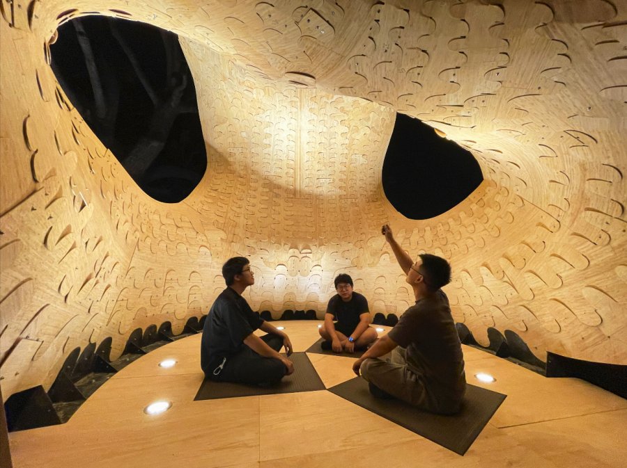 盛郁庭說「這個作品所有的資訊都在電腦裡由我們跟老師對接後製造。」Michael Hansmeyer透過coding程式編碼來描述虛擬空間的摺紙所摺出的一個塔塔柱周圍有一個直徑6米的柱飾由約1萬4千根不同長度的鋁管構成懸吊於天花板上總重量約2噸展現數位工藝美學。盛郁庭表示過去是由師傅來承襲這個技藝現在我們思考的是是不是有機會透過電腦或數據的方法把這些技藝傳承下來且電腦有機會可以學得更快甚至有更多的變異、可能性。