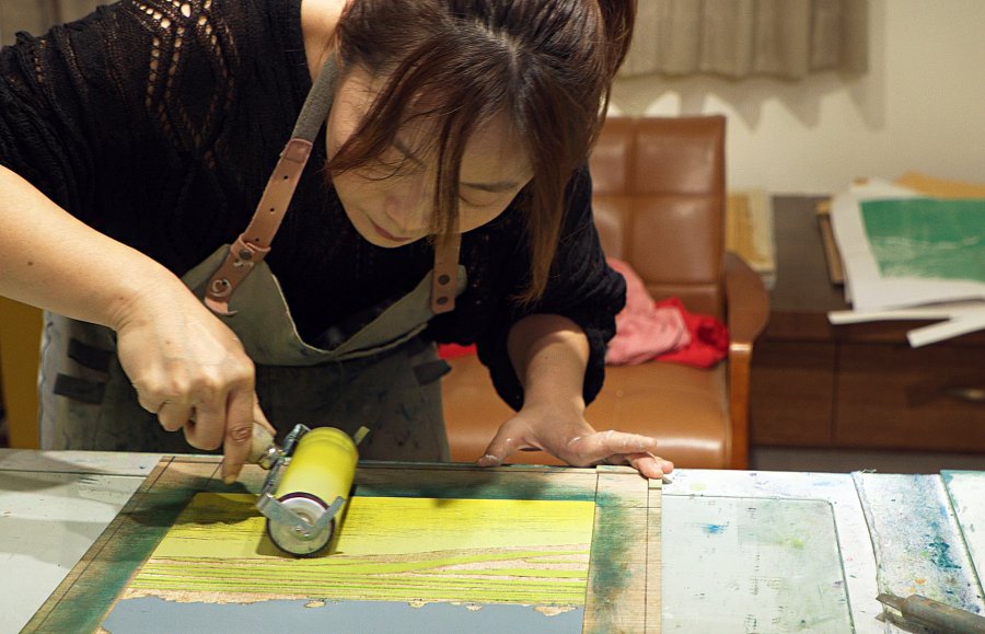 李屏宜憶起第一次接觸木刻版畫就喜歡上創作過程,從製版、刻版、調油墨到印製,一層又一層,需要時間的累積,最吸引她的是「木板有毛細孔、有自然的木紋基底,是很東方性的一種符號和質感,與橡膠板完全不同。」