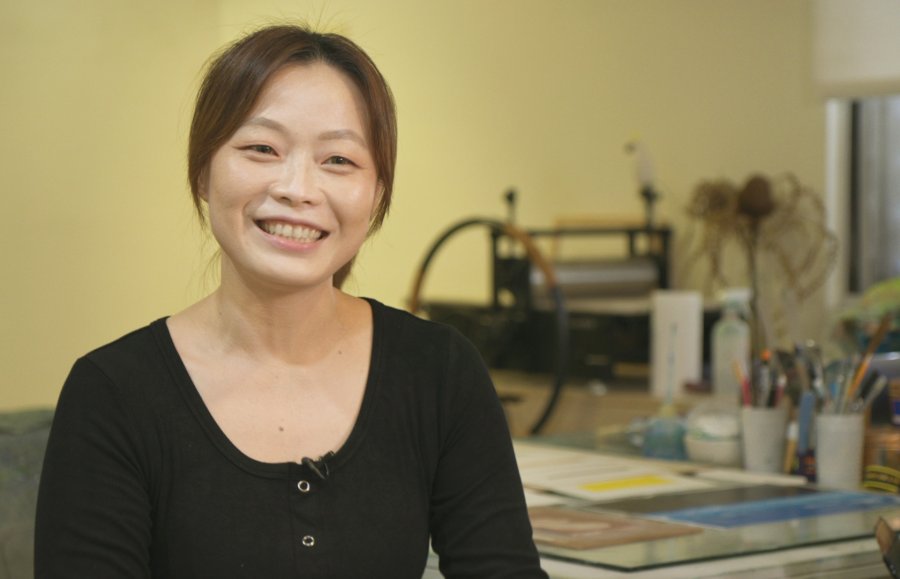 她的《呼吸:風景》系列,讓人在動蕩不安的疫情時代下重新聚焦土地情感,展現寧靜與美好,一舉奪下高雄市立美術館的「2022高雄獎」首獎。製作團隊不僅隨她回到該系列創作的起點池上,她也分享當年如何突破作品,「某天工作到很晚,壓印後掀開作品卻發現『板子比印出來的紙本還要好看』,於是決定將板和畫一起展出!」而這以往僅作為創作載體的「版」與作品的「畫」並置後所創造的「鏡像風景」,打造了刻板與畫作虛實對話的獨特性,也突破了傳統版畫的複數性,獲得評審的青睞,為版畫創作開創嶄新篇章。