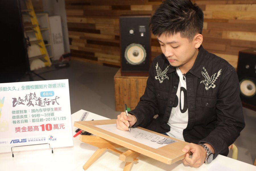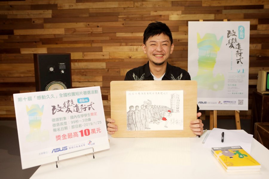 由華碩文教基金會和公視共同主辦的【感動久久】短片徵選活動,今年邁入第十屆,特別與網路紅人合作,邀請到知名網路插畫家「聞氫哥」直播開講,現場挑戰為今年的徵選主題【改變進行式】創作幽默圖文,並且一邊作畫一邊分享自己從Nobody到Somebody的改變故事,除了鼓勵年輕人勇敢改變外,也呼籲學生粉絲們趕快用鏡頭記錄下身邊的改變故事,一起看見改變的價值!