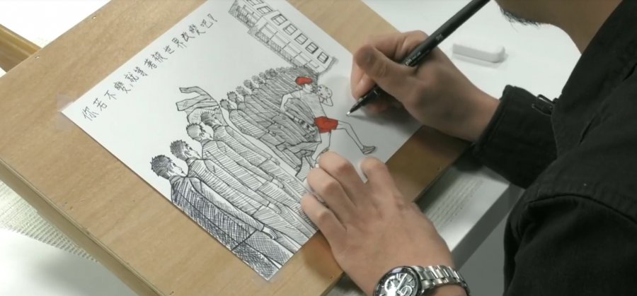 這次與【感動久久 改變進行式】全國校園短片徵選活動合作,在直播中所完成的手繪創作圖,聞氫哥介紹畫面中安排了一長排身穿西裝的黑白人們,就像是每天循規蹈矩的我們,因為想要從這樣僵硬的體制化中跳脫出來,因此安排了一個原本也在隊伍中的人脫隊,而他的裝扮也變身成為了畫家,希望能帶給讀者一種勇敢改變、大膽追夢的表現,最後準時在直播時間中完成,還特別為畫作題上了字:『你若不變,就等著被世界改變吧!』,呼應本屆活動主題,聞氫哥也不忘向還在學校就讀的粉絲們喊話:「在你我身邊有許多充滿正能量的故事,需要被看見!所以看完直播後,別忘了發揮你們的影像力,勇敢拿起鏡頭記錄下身邊正在改變或需要改變故事,讓【改變進行式】成為你我的事!」