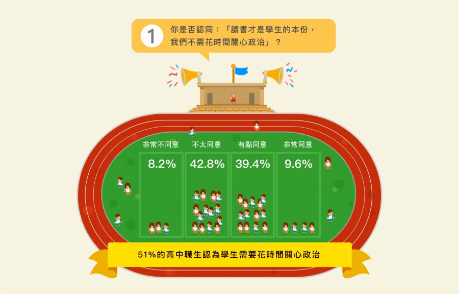 《青春發言人》特別點出,即便高中職生尚未有投票權,但學生們對於社會議題的關心也超乎想像,調查中有92%的受訪者認為「學生仍需花時間關心政治」。可見對受訪的高中職生們而言,現階段除了讀書以外,公民參與也是一件很重要的事。中正大學傳播系管中祥教授分析,近年社會運動年輕化,參與社會改革的學生不限於大學,也有不少中學及小學生。台灣人的民主實踐從小就已養成,建立起公民意識與社會責任。
