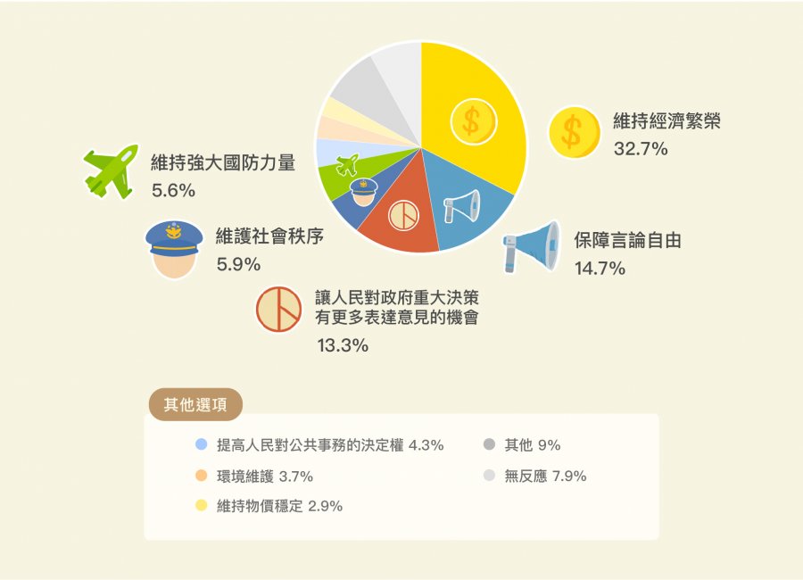 該問卷也針對未來10年的社會發展目標進行調查,其中有32.7%受訪者認為「維持經濟繁榮」最重要,佔比最高。其次是佔14.7%的「保障言論自由」、以及「讓人民對政府重大決策有更多表達意見的機會」佔13.3%。在這個數據中,第一高的「維持經濟繁榮」比第二高「保障言論自由」多了兩倍以上,可見年輕世代對於台灣未來的共識,還是著重在民生方面;但從「保障言論自由」和「讓人民對政府重大決策有更多表達意見的機會」分據重要性的第二、第三名來看,「民主自由」同樣是當前青少年們相當重視的社會發展目標。