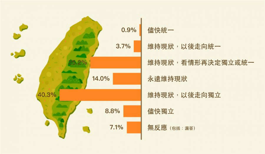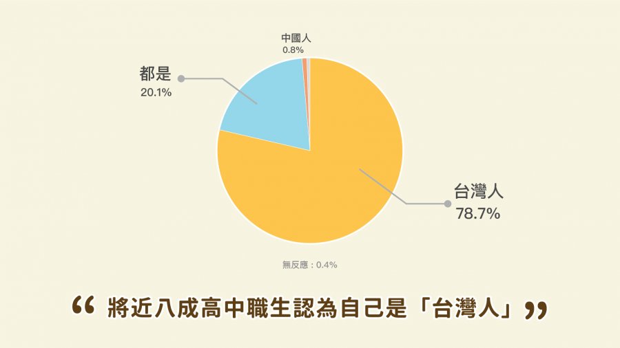 本次受訪的兩千多位高中職生當中,有78.7%的受訪者認為自己是「台灣人」,遠高於「中國人」(0.8%)與「兩者皆是」(20.1%)的選項,可見「台灣」這個名詞已成為多數受訪高中職生對「我是哪裡人」的直覺反應。而在被問及最敏感的兩岸關係時,有40.3%的受訪者希望:「維持現狀,以後走向獨立」。其次是「維持現狀,看情形再決定獨立或統一」(25.2%),以及「永遠維持現狀」(14%)。
