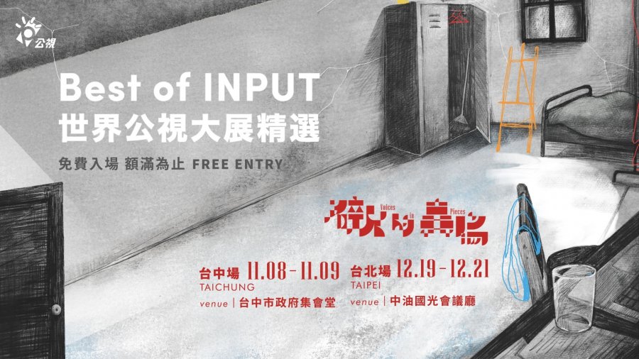本屆「世界公視大展精選」活動將於11月8日至9日在臺中市政府臺灣大道市政大樓集會堂率先登場,12月19日至21日於台北中油大樓國光廳接續播映。座位有限,額滿為止,請前往KKTIX官方網站免費索取門票。各項詳情請上官網查詢或臉書搜尋「世界公視大展精選 Best of INPUT」。