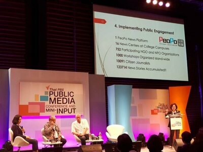 [曼谷訊]臺灣公共電視南向交流,再度邁開新腳步,陳郁秀董事長受邀參與國際公共媒體會議暨迷你世界公視大展(ThaiPBSPublicMediaConference&MiniINPUT)擔任主講人,分享台灣公視在數位時代的創新發展、追求優質節目與培養公眾參與等經驗。國際公共媒體會議暨迷你世界公視大展(ThaiPBSPublicMediaConference&MiniINPUT)於11月15日、16日由今年成立十週年的泰國公視主辦,廣邀泰國媒體產官學界與年輕學子出席。會議的主旨為提高全球公共媒體的角色與價